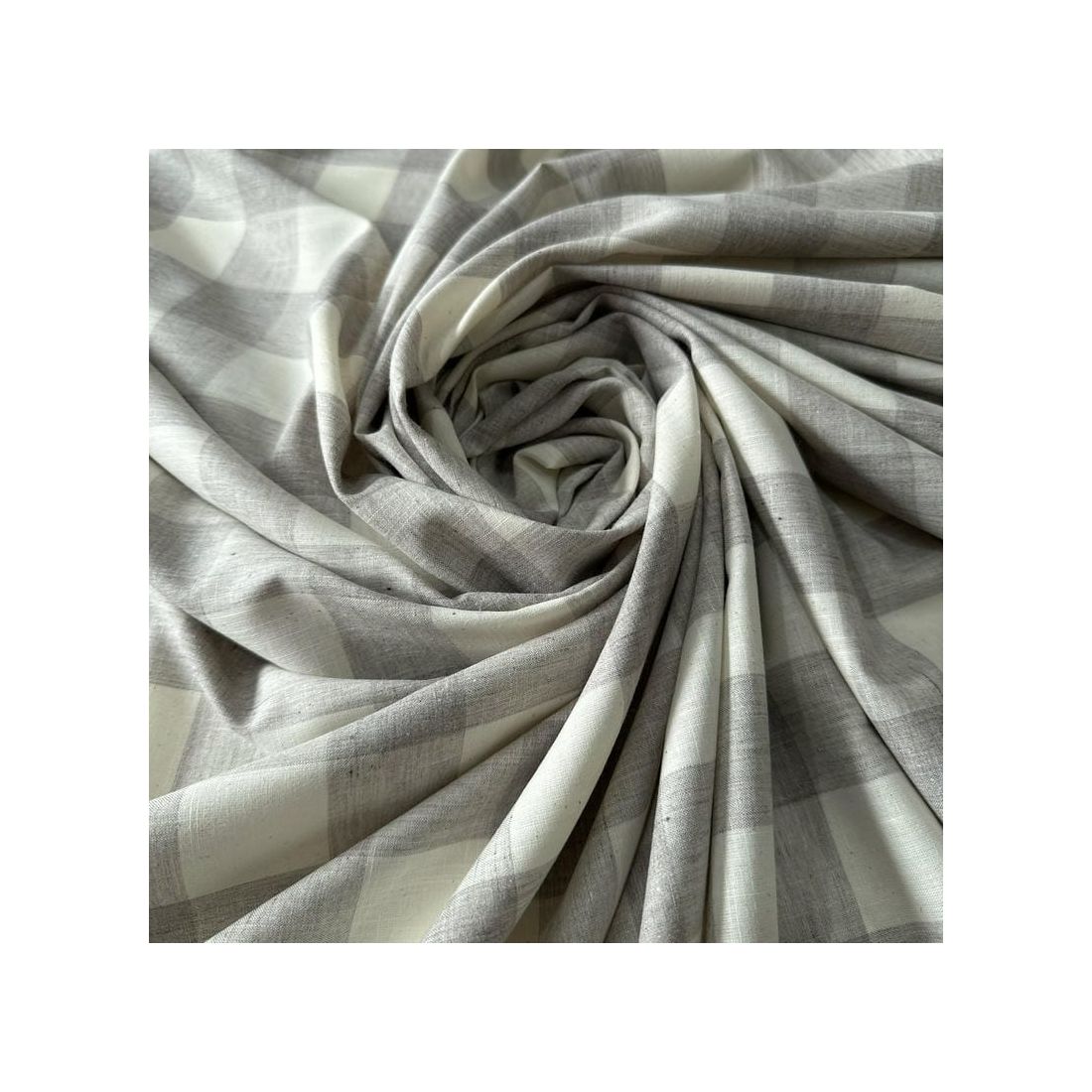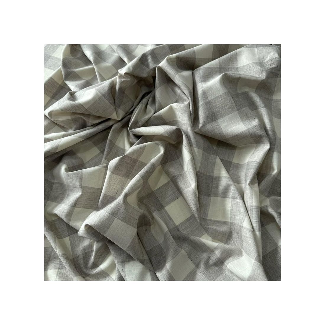 Tecido Cambraia De Algodão Xadrez Cinza Claro com aparência natural, toque macio e caimento leve. Ideal para roupas frescas e elegantes, combinando o visual do linho com o conforto da viscose.