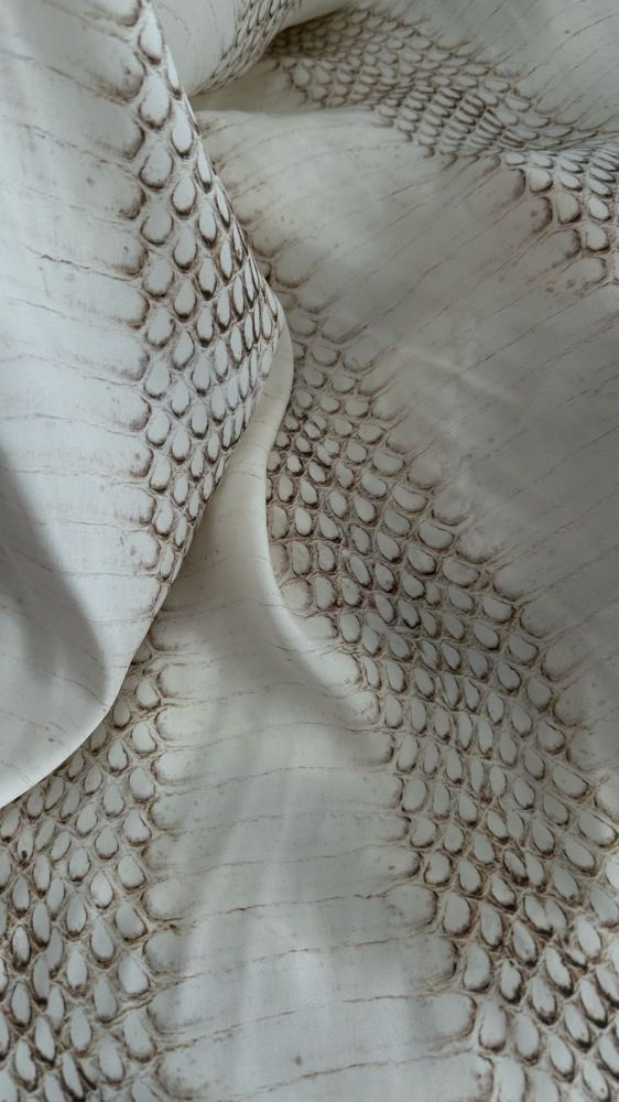 O Tecido Cetim de Seda Estampado Snake Skin é um tecido nobre produzido com fios de Seda natural em ligamento cetim, técnica que cria uma superfície lisa e brilhante de um lado e levemente fosca do outro. É reconhecido pelo brilho sofisticado, toque extremamente suave e caimento fluido, sendo amplamente utilizado na moda de alto padrão.