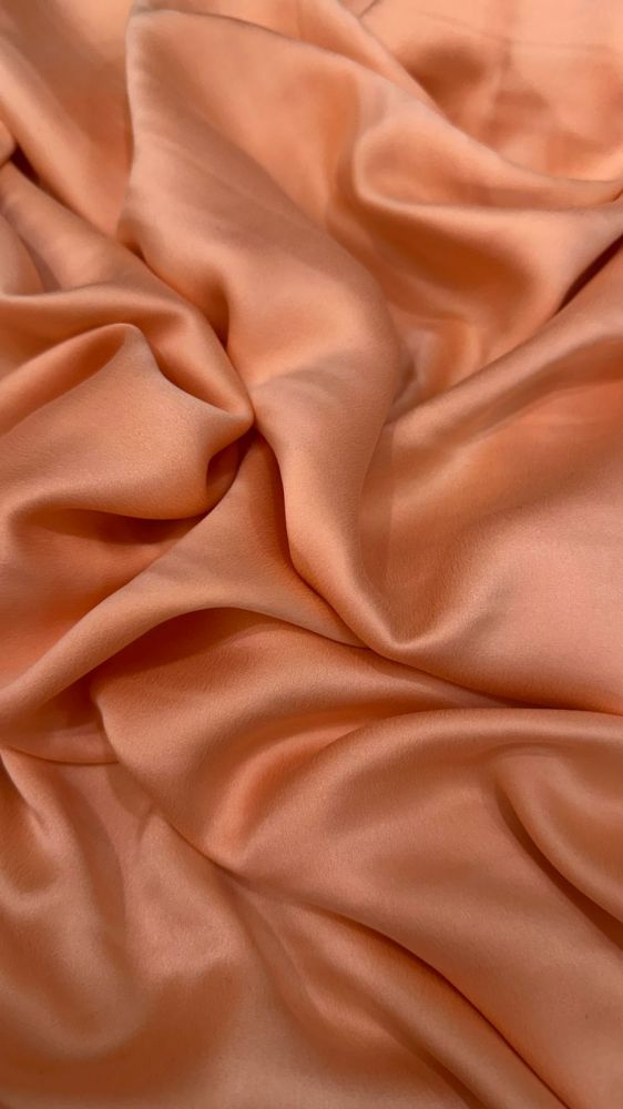 Tecido Cetim de Seda Liso Estonado Pêssego com superfície lisa, brilho elegante e caimento fluido. Ideal para vestidos de festa, blusas refinadas e peças que exigem acabamento luxuoso e toque macio.