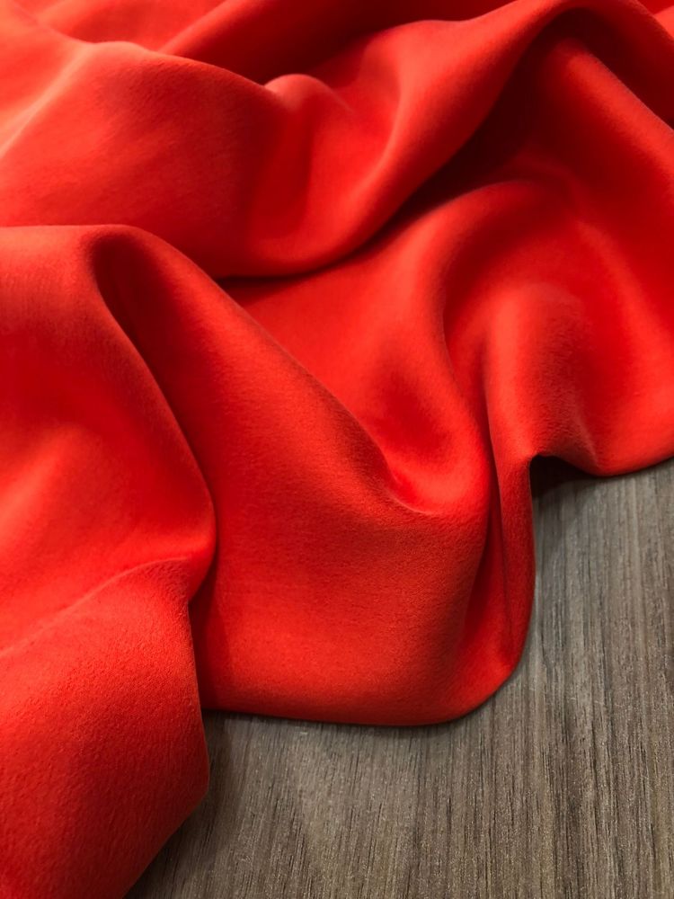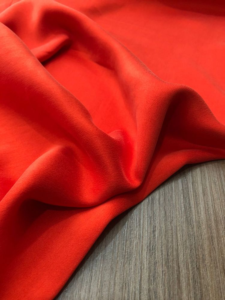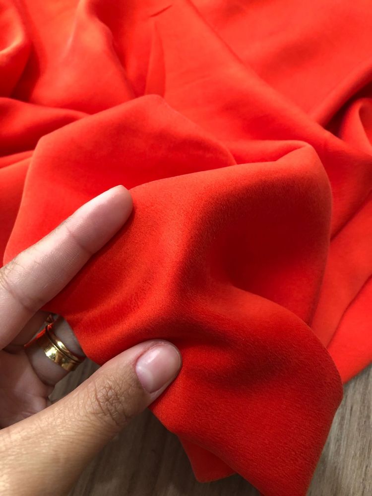 Tecido Cetim de Seda Liso Estonado Vermelho Coral com superfície lisa, brilho elegante e caimento fluido. Ideal para vestidos de festa, blusas refinadas e peças que exigem acabamento luxuoso e toque macio.