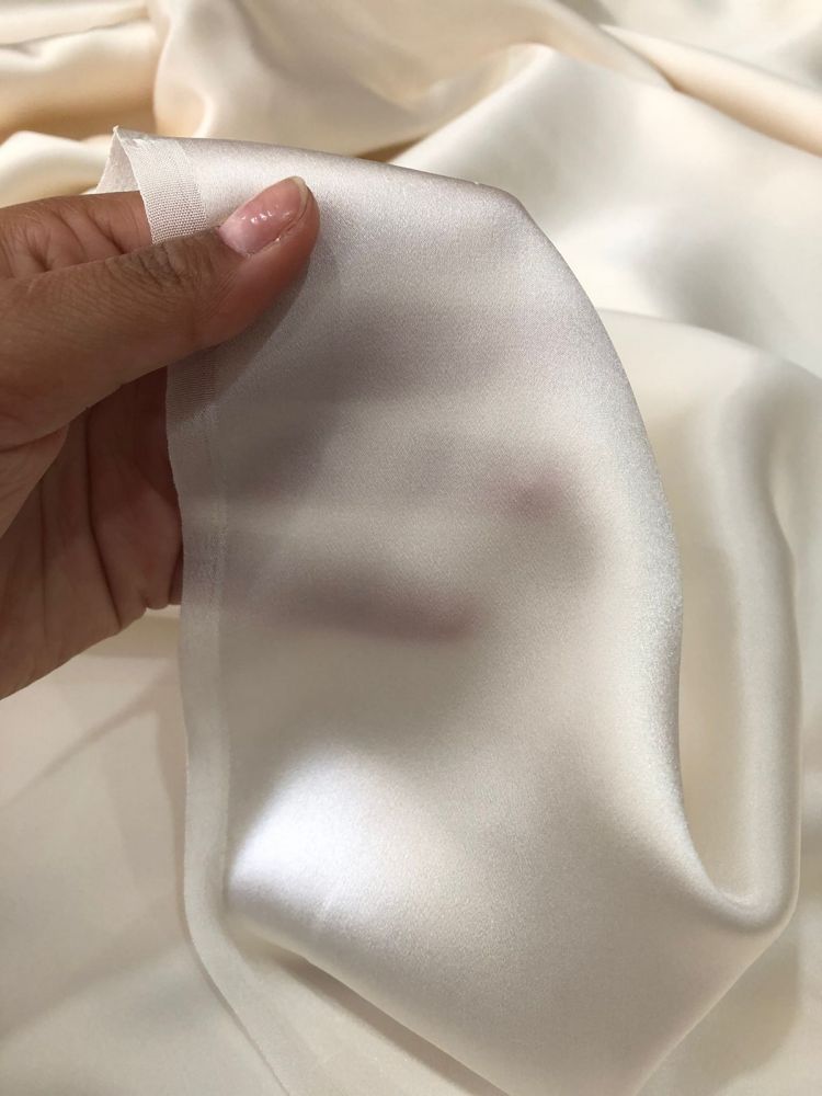 O Tecido Cetim de Seda Liso Off White é um tecido nobre produzido com fios de Seda natural em ligamento cetim, técnica que cria uma superfície lisa e brilhante de um lado e levemente fosca do outro. É reconhecido pelo brilho sofisticado, toque extremamente suave e caimento fluido, sendo amplamente utilizado na moda de alto padrão.