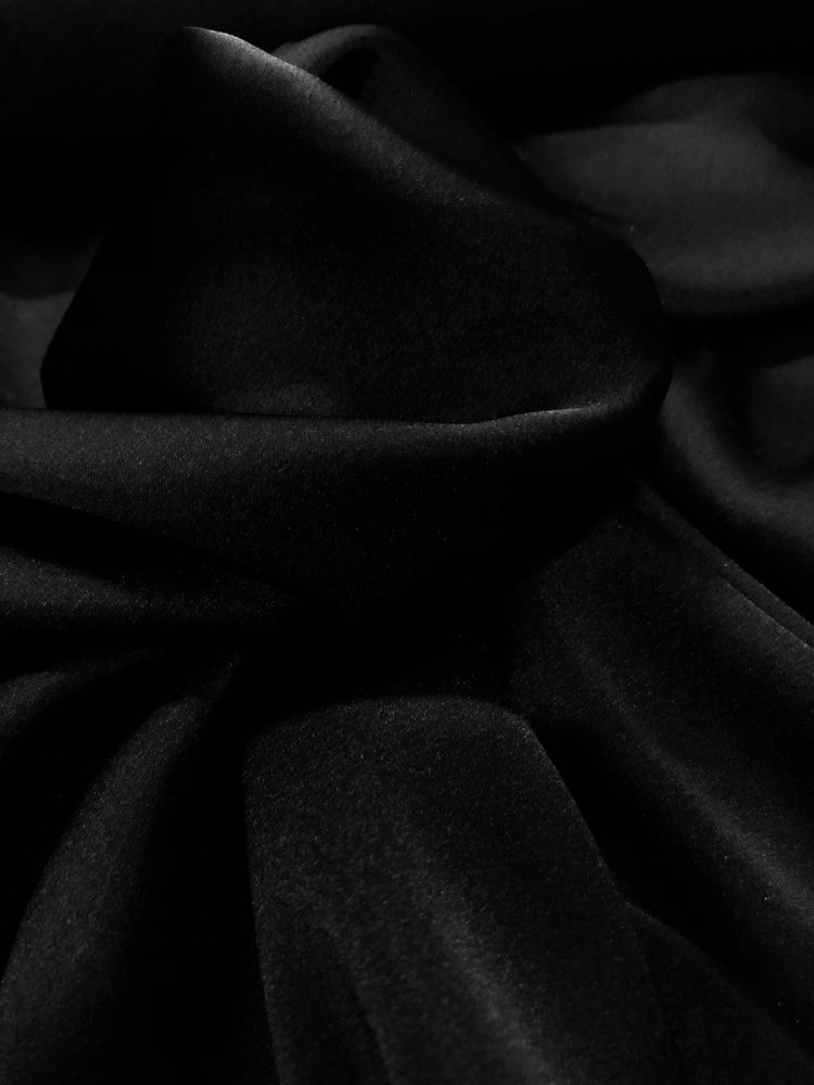 Tecido Cetim Toque de Seda Preto com superfície lisa, brilho sofisticado e toque extremamente macio. Ideal para peças refinadas que exigem fluidez e acabamento elegante.