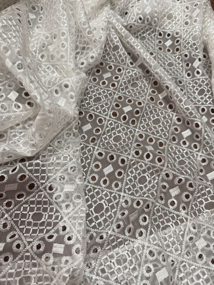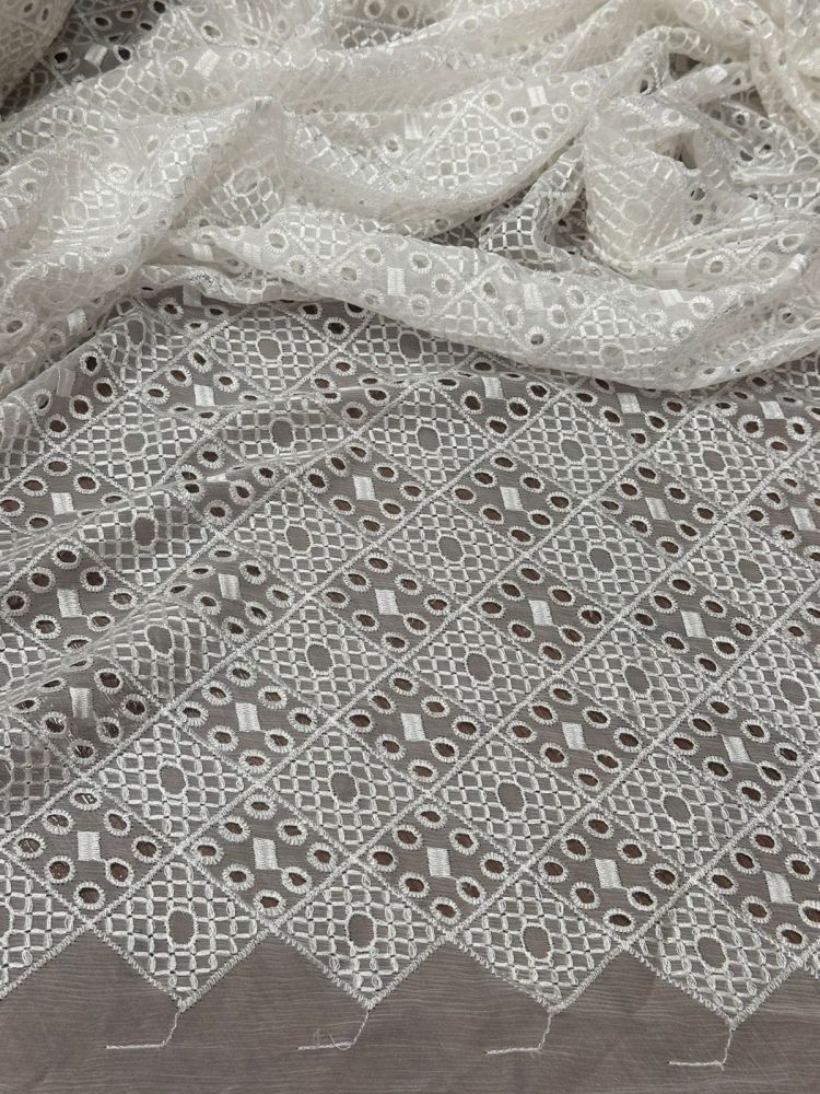 Escolha o Tecido Chiffon De Seda Bordado Off White para criar peças luxuosas, leves e com acabamento impecável.