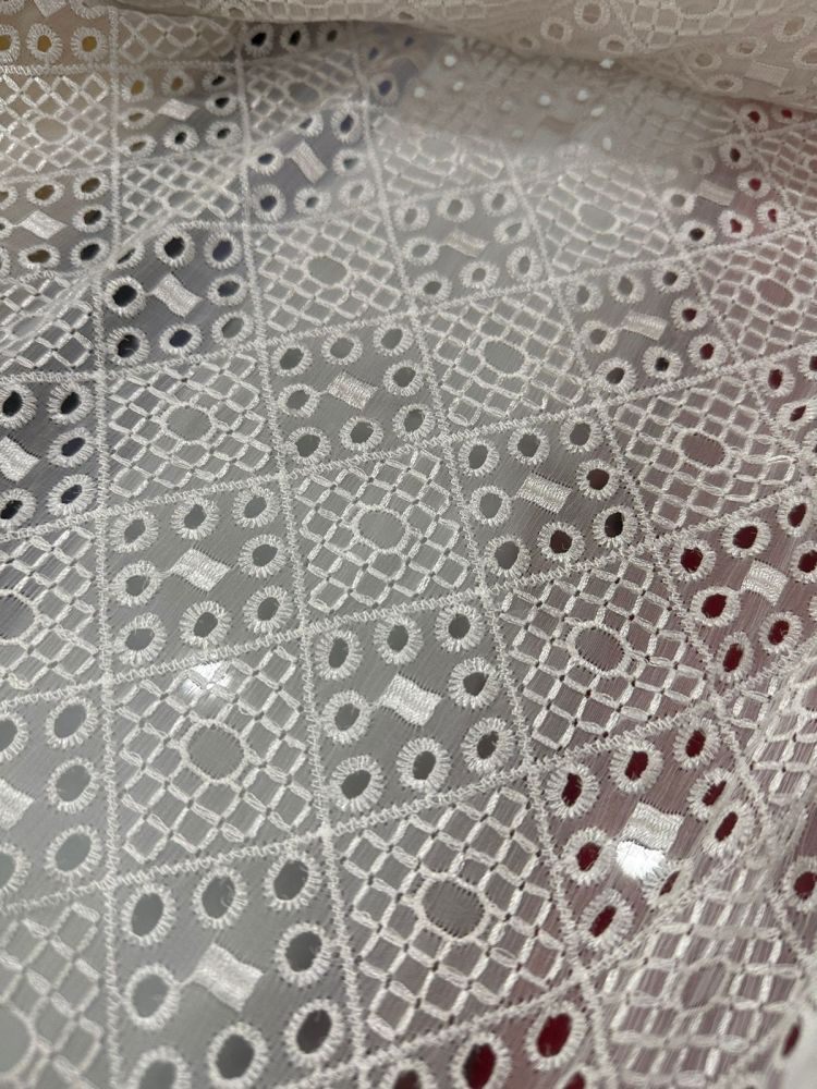 O Tecido Chiffon De Seda Bordado Off White com transparência delicada, toque extremamente suave e caimento fluido. Ideal para peças sofisticadas que exigem leveza e movimento refinado.