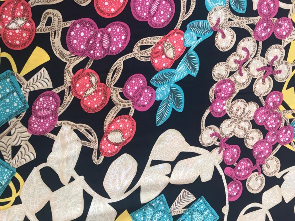 O Tecido Crepe de Chine Estampado Jardim Exótico Nocturne é um tecido leve, tradicionalmente feito de Seda com fios altamente torcidos, resultando em uma superfície levemente texturizada e caimento fluido. É conhecido por sua aparência refinada e toque suave, adequado tanto para peças sofisticadas quanto para looks casuais elegantes.