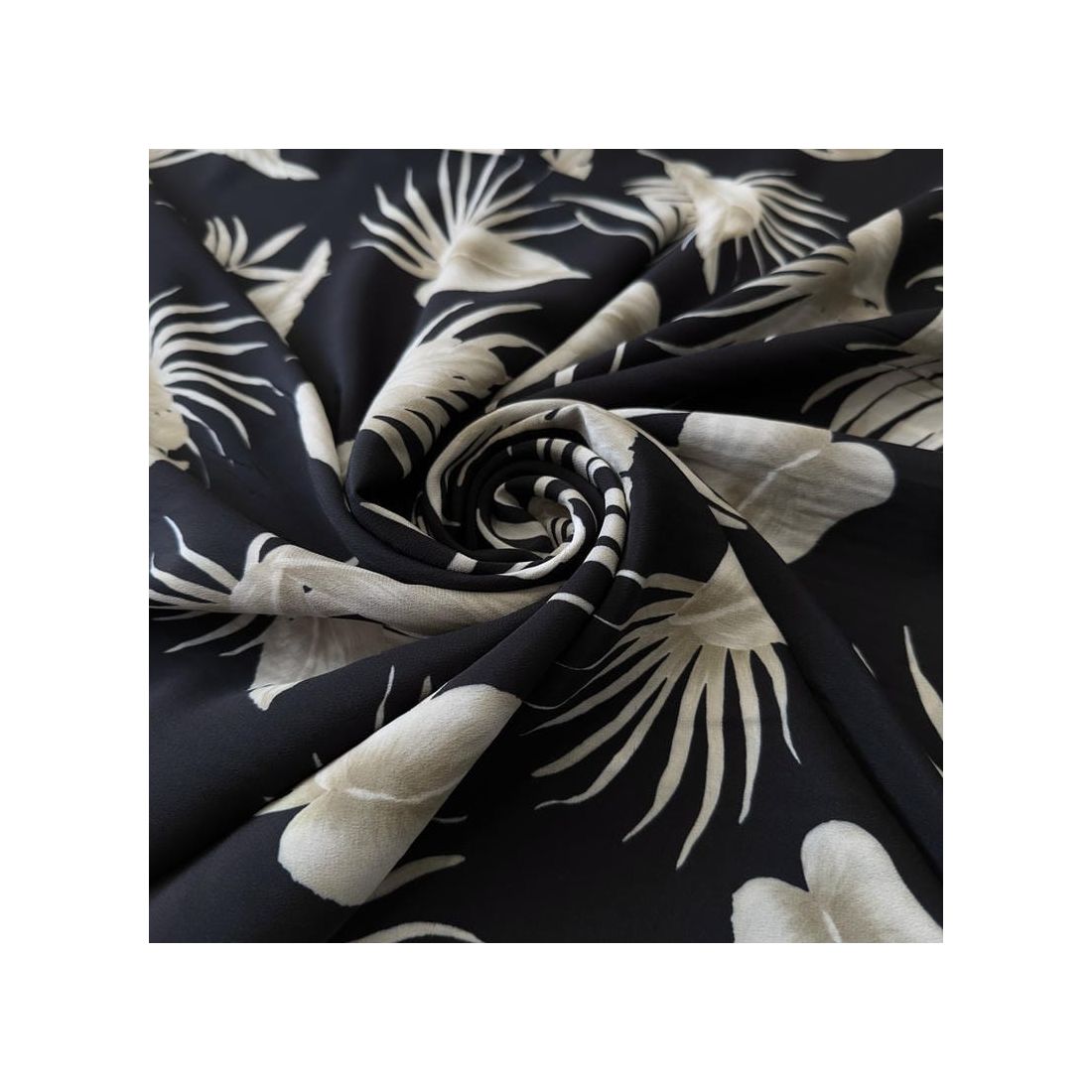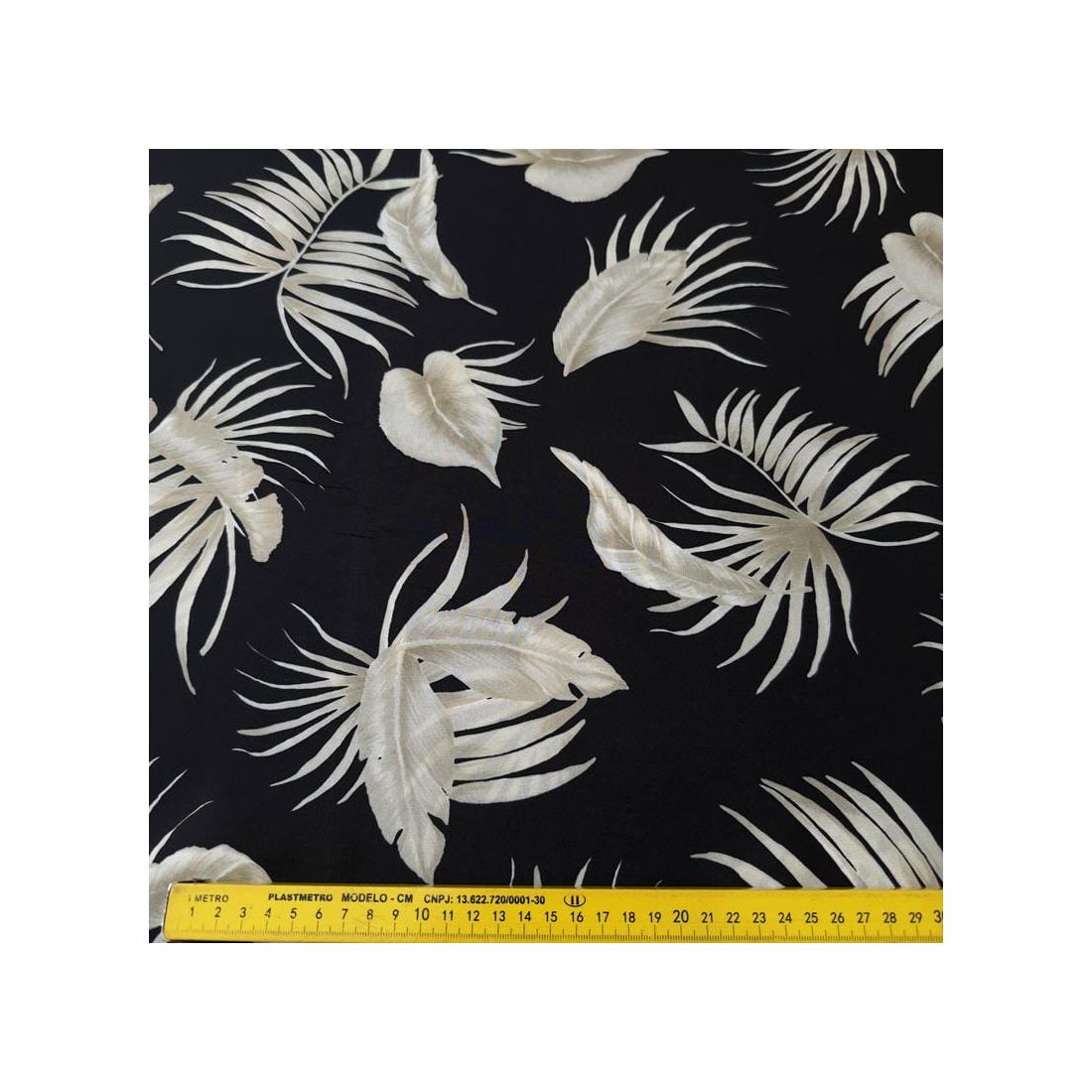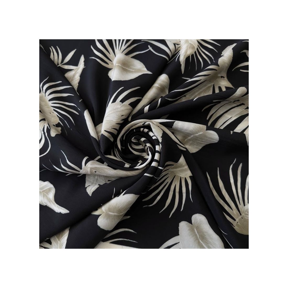 Tecido Crepe de Chine Estampado Tropical Leaves Noir • Conexão Tecidos