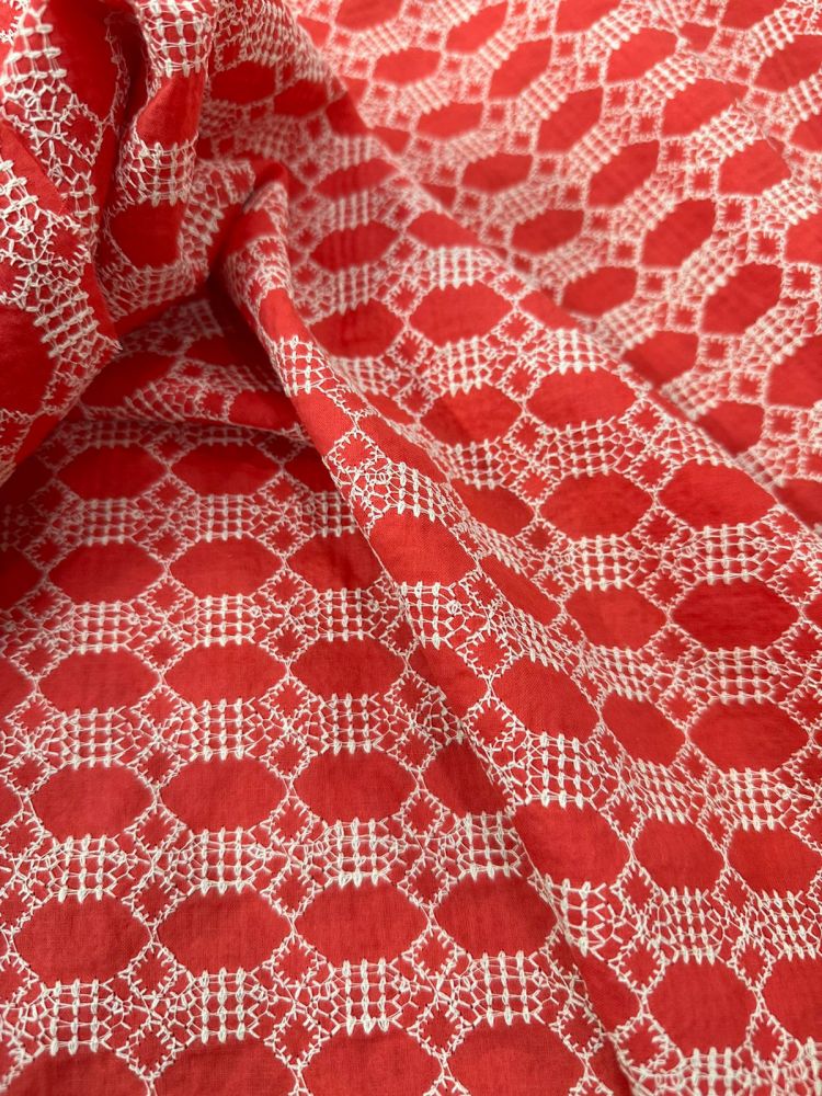 Tecido Laise Vermelha Indiana com bordados vazados, toque leve e visual romântico. Ideal para peças femininas delicadas e produções com acabamento artesanal sofisticado.