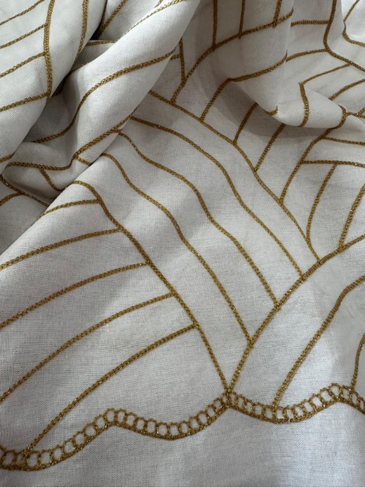 Tecido Linho Misto Off Bordado Campina Dourada com aparência natural e caimento equilibrado. Ideal para peças elegantes e confortáveis, combinando o visual sofisticado do linho com maior maciez e praticidade.
