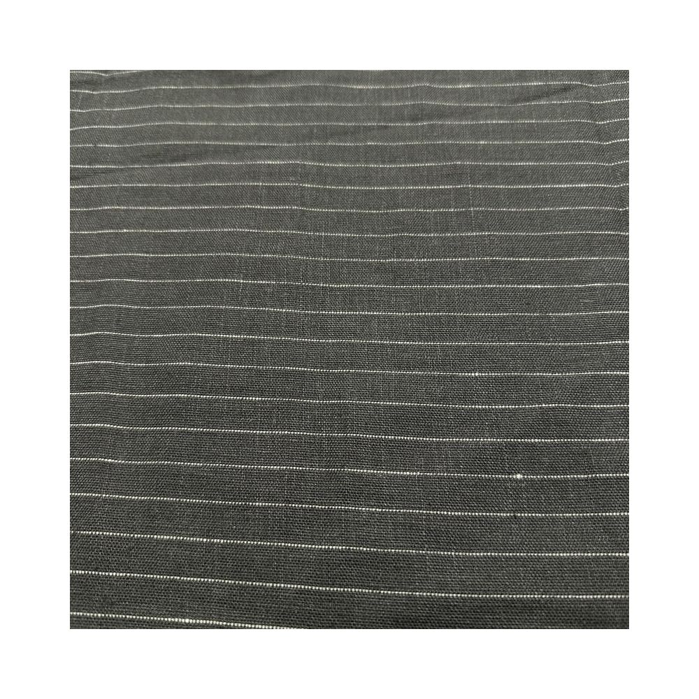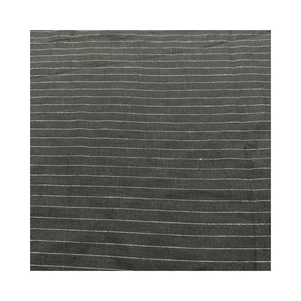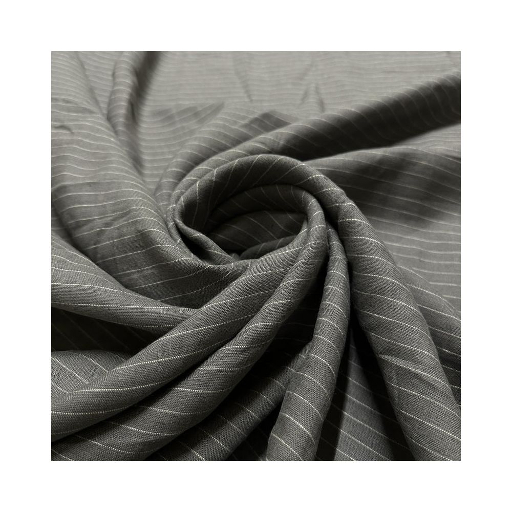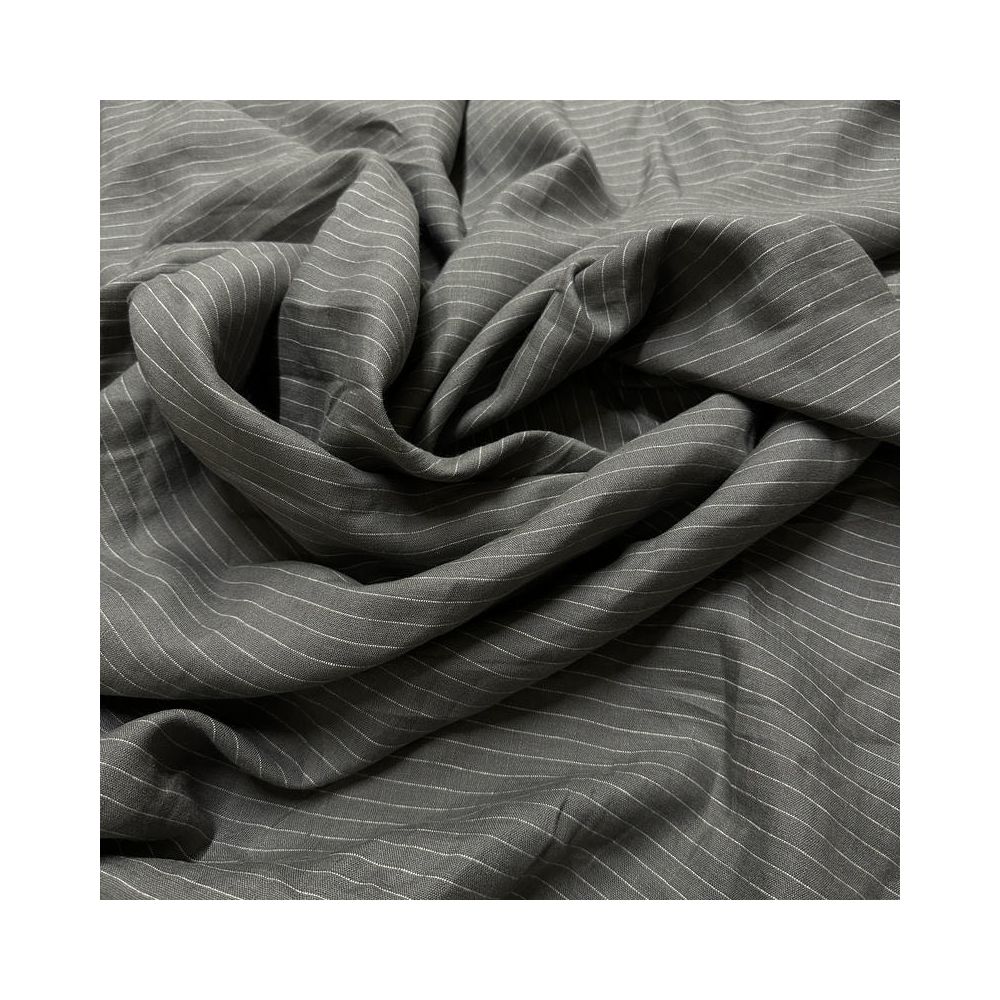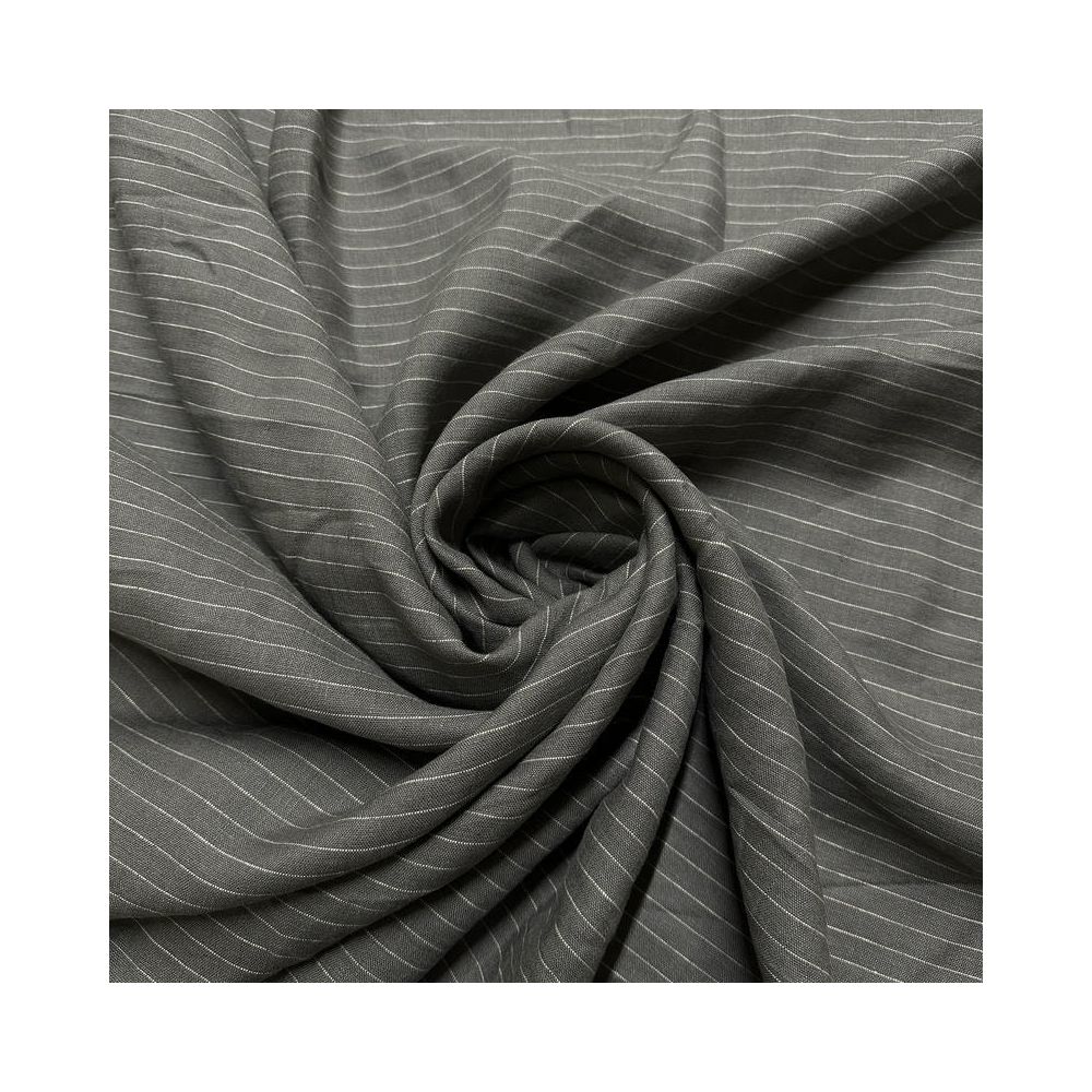 TTecido Linho Puro Cinza Listrado com textura natural, alta respirabilidade e caimento elegante. Ideal para roupas refinadas e peças que valorizam o visual rústico sofisticado.