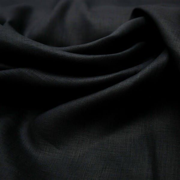 Tecido Linho Puro Liso Preto com toque macio, textura suave e caimento fluido. Ideal para peças elegantes que combinam leveza, movimento e acabamento sofisticado.