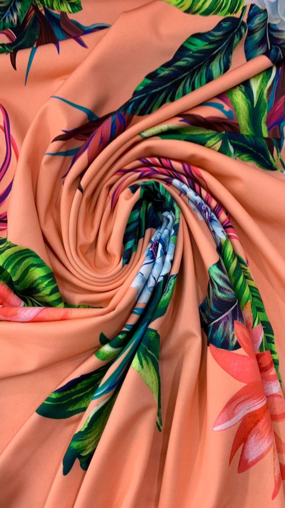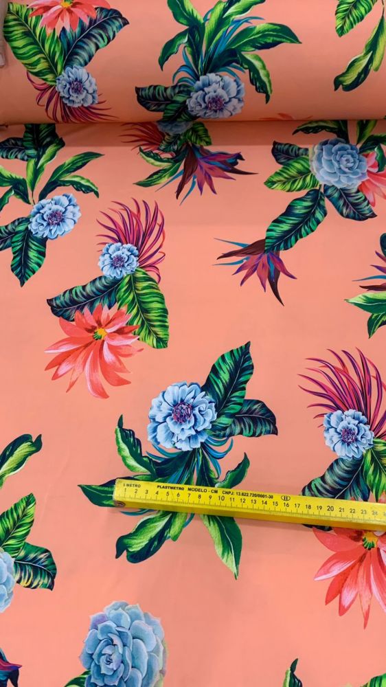 Tecido Malha Neoprene Tropical Coral Paraíso – Conforto Térmico e Estrutura Elegante