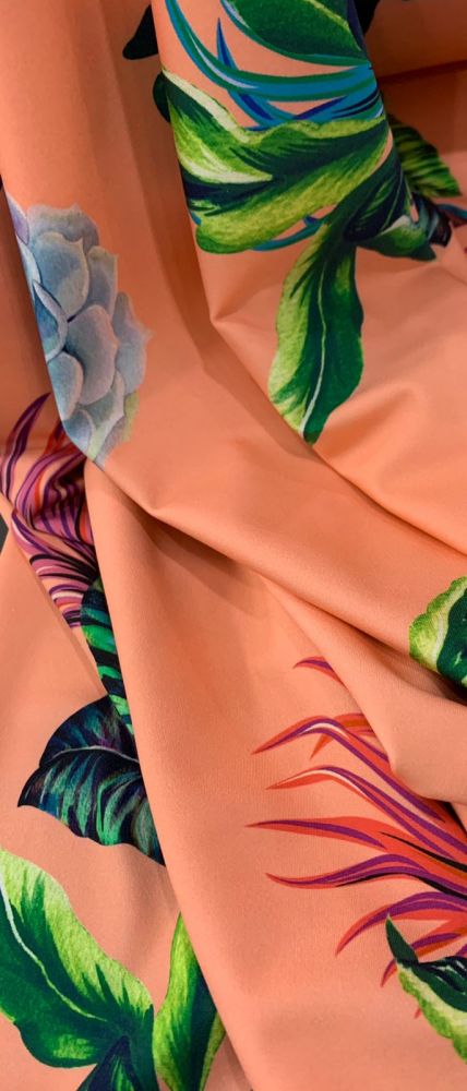 Tecido Malha Neoprene Tropical Coral Paraíso com toque macio, excelente isolamento térmico e estrutura encorpada. Ideal para peças de inverno que exigem elegância, conforto e durabilidade.