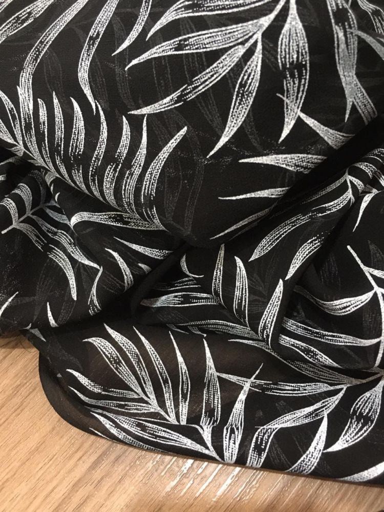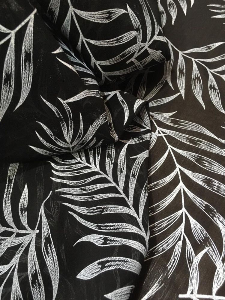 Tecido Musselina Seda Pura Palmeiras Noturnas é extremamente leve e fino, conhecido por sua transparência delicada e movimento suave. Produzida com fios finos de Seda, apresenta aparência etérea e acabamento refinado, sendo amplamente utilizada na alta-costura e em peças sofisticadas.