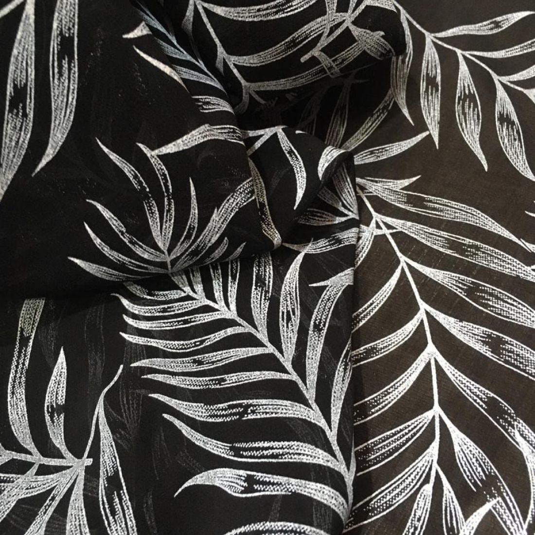 Tecido Musseline Seda Pura Palmeiras Noturnas é extremamente leve e fino, conhecido por sua transparência delicada e movimento suave. Produzida com fios finos de seda, apresenta aparência etérea e acabamento refinado, sendo amplamente utilizada na alta-costura e em peças sofisticadas.