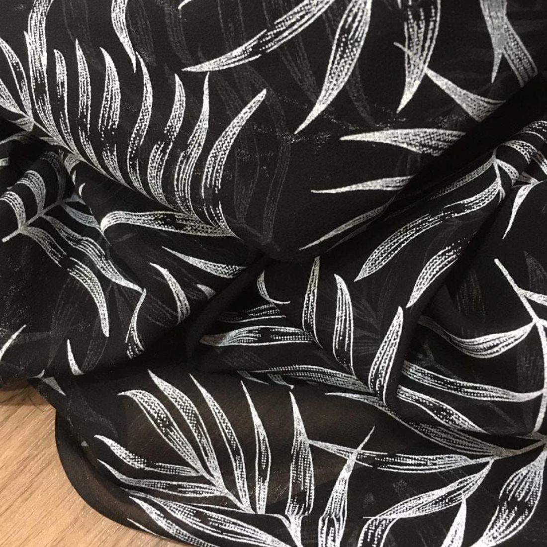 Tecido Musseline Seda Pura Palmeiras Noturnas com textura fina, transparência elegante e caimento extremamente fluido. Ideal para peças sofisticadas que valorizam leveza e movimento natural.