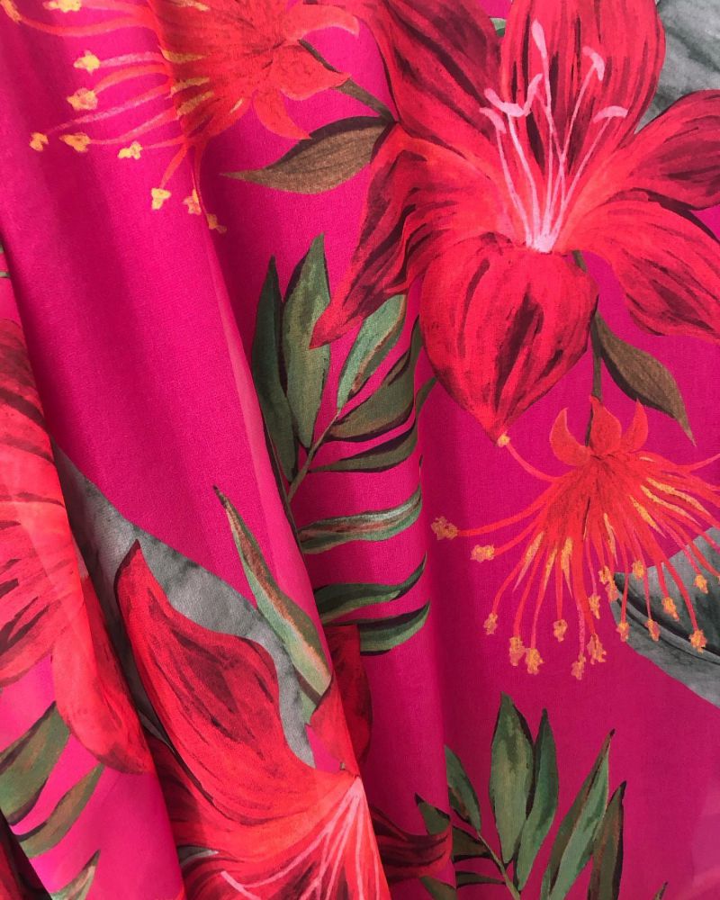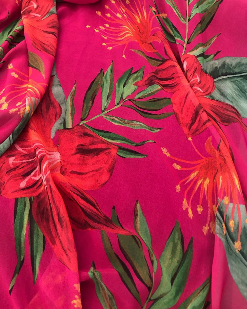 Tecido Musselina Toque De Seda Estampada Hibisco Rubi com textura fina, transparência suave e caimento leve. Ideal para peças delicadas que valorizam movimento e acabamento elegante.