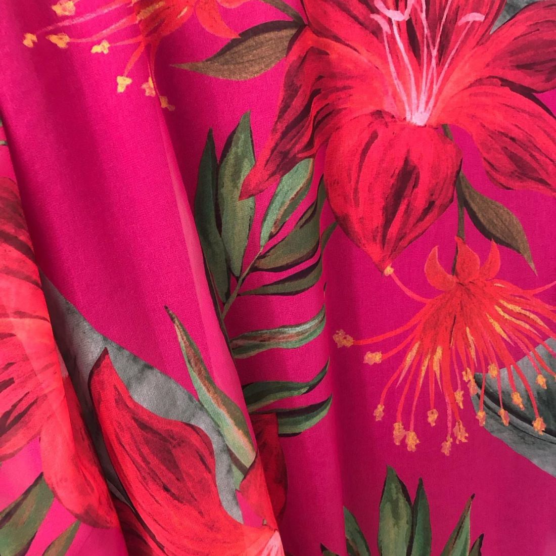Tecido Musseline Toque De Seda Estampada Hibisco Rubi com textura fina, transparência suave e caimento leve. Ideal para peças delicadas que valorizam movimento e acabamento elegante.