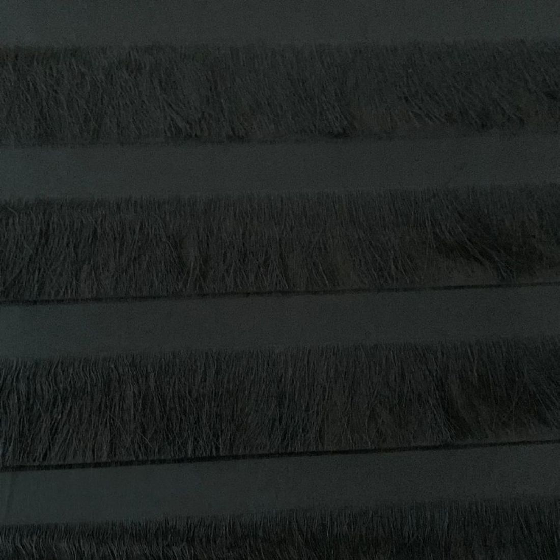 Tecido Musseline Franjas Preta com textura fina, transparência suave e caimento leve. Ideal para peças delicadas que valorizam movimento e acabamento elegante.