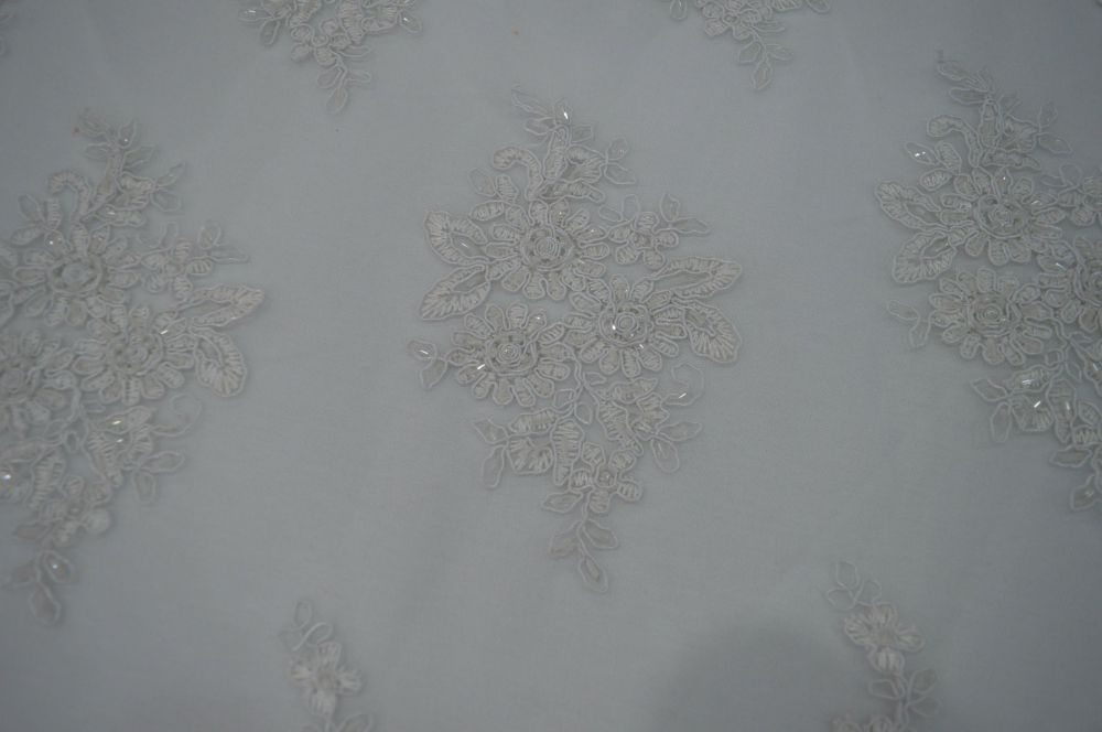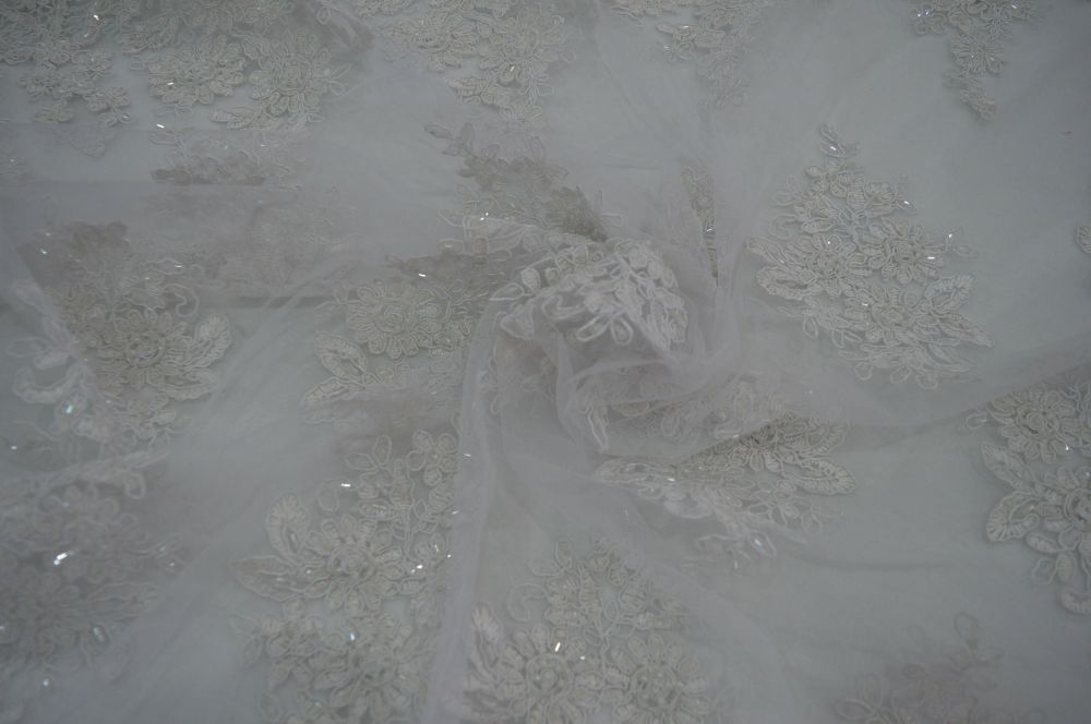 Tecido Tule Bordado Com Pedrarias Branco Off com textura fina, transparência suave e caimento leve. Ideal para peças delicadas que valorizam movimento e acabamento elegante.