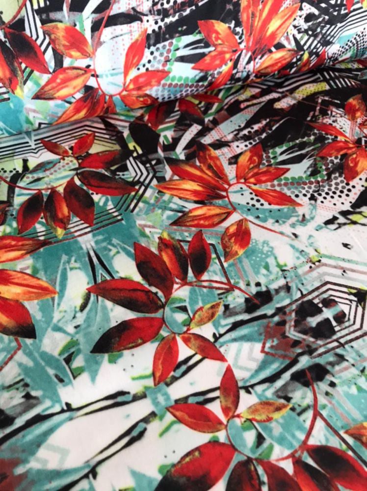 Tecido Sarja Acetinada Estampada Abstract Colors plano reconhecido pela trama diagonal característica, que confere resistência e durabilidade superiores. É amplamente utilizada na confecção de roupas estruturadas e peças que exigem maior resistência ao desgaste.