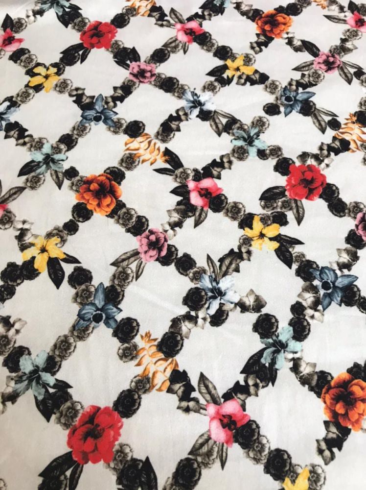 Tecido Sarja Acetinada Estampada Xadrez Floral – Resistente, Estruturado e Versátil