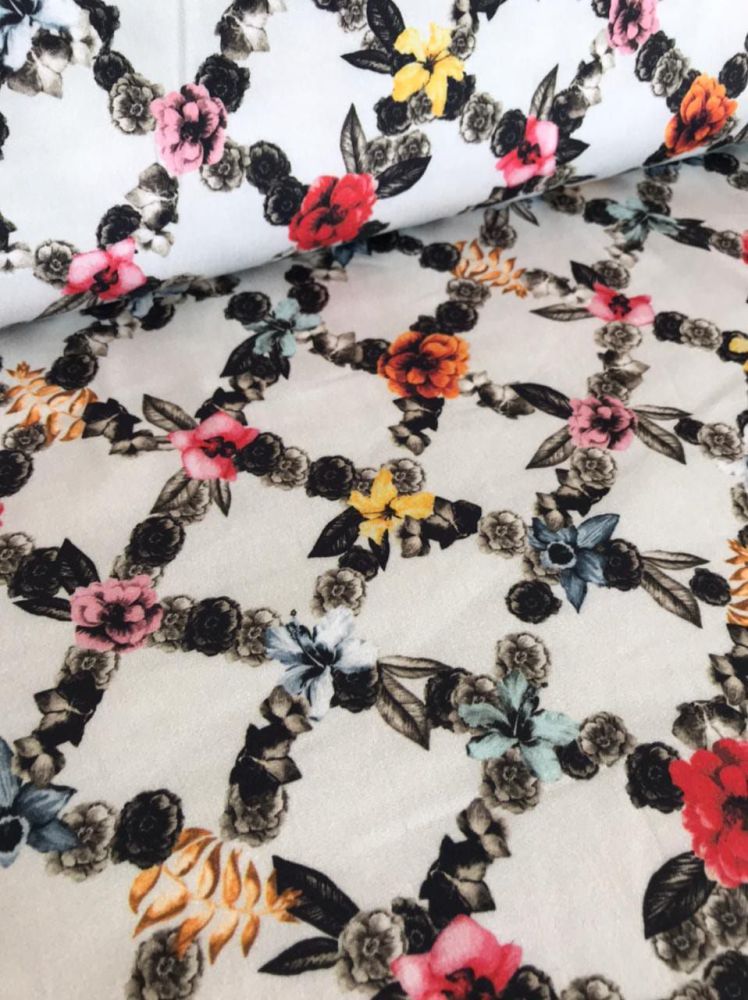 Tecido Sarja Acetinada Estampada Xadrez Floral plano reconhecido pela trama diagonal característica, que confere resistência e durabilidade superiores. É amplamente utilizada na confecção de roupas estruturadas e peças que exigem maior resistência ao desgaste.
