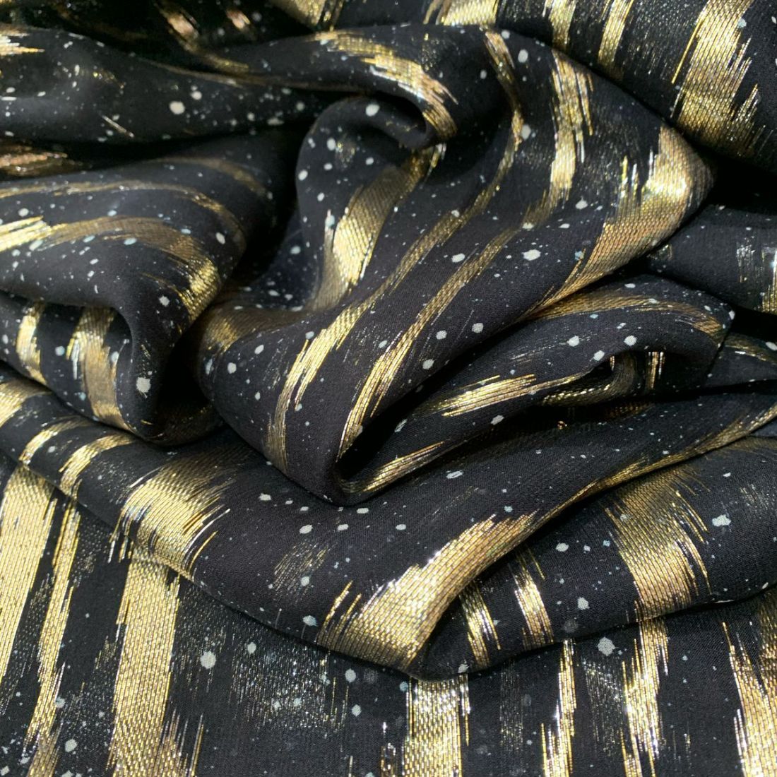 Tecido Musseline De Seda Com Foil com aparência natural, toque macio e caimento leve. Ideal para roupas frescas e elegantes, combinando o visual do linho com o conforto da viscose.