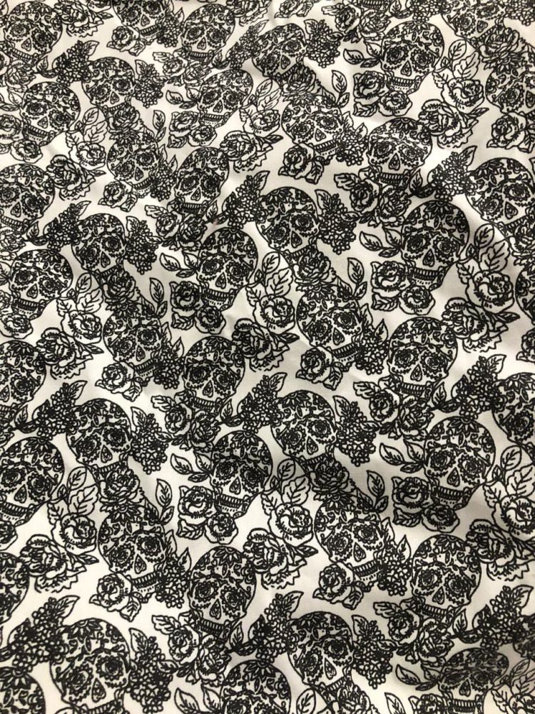 Tecido Tricoline Caveira Mexicana com superfície lisa, toque macio e estrutura leve. Ideal para roupas, artesanato e peças que exigem acabamento delicado e costura precisa.
