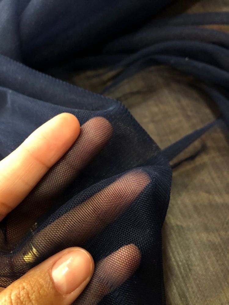 Tecido Tule Ilusion Azul Marinho extremamente fino e transparente, desenvolvido para criar efeito visual quase imperceptível sobre a pele. É amplamente utilizado em vestidos de noiva e moda festa para acabamento delicado e sofisticado.