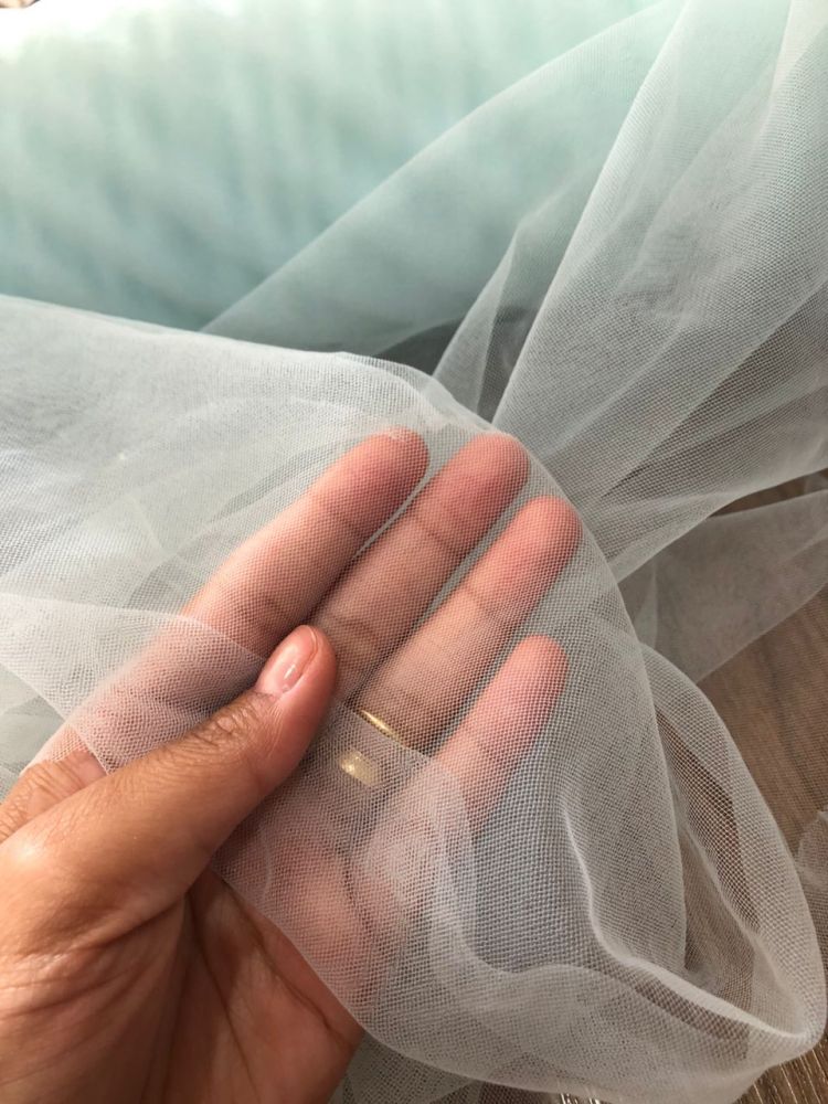 Tecido Tule Ilusion Azul Piscina extremamente fino e transparente, desenvolvido para criar efeito visual quase imperceptível sobre a pele. É amplamente utilizado em vestidos de noiva e moda festa para acabamento delicado e sofisticado.