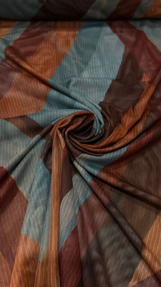 Tecido Tule De Malha Estampado Geometria Atlântica Terra com trama fina, toque suave e excelente resistência. Ideal para peças delicadas que exigem leveza com maior durabilidade.